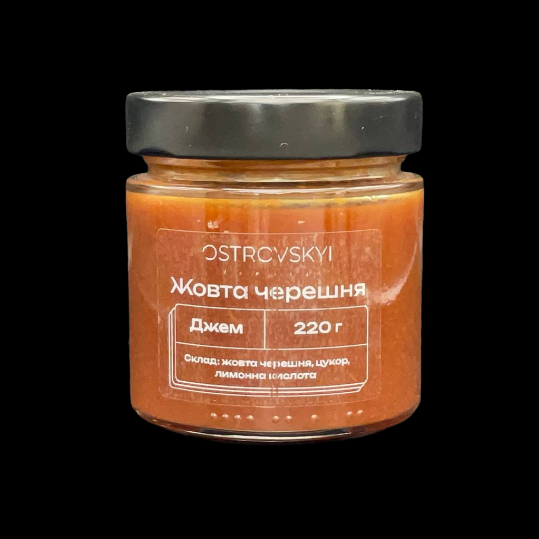 Відкрийте для себе унікальний джем із стиглої жовтої черешні, вирощеної в нашому саду без хімії. У кожній баночці – ретельно відібрані плоди, які складають не менше 60% продукту.