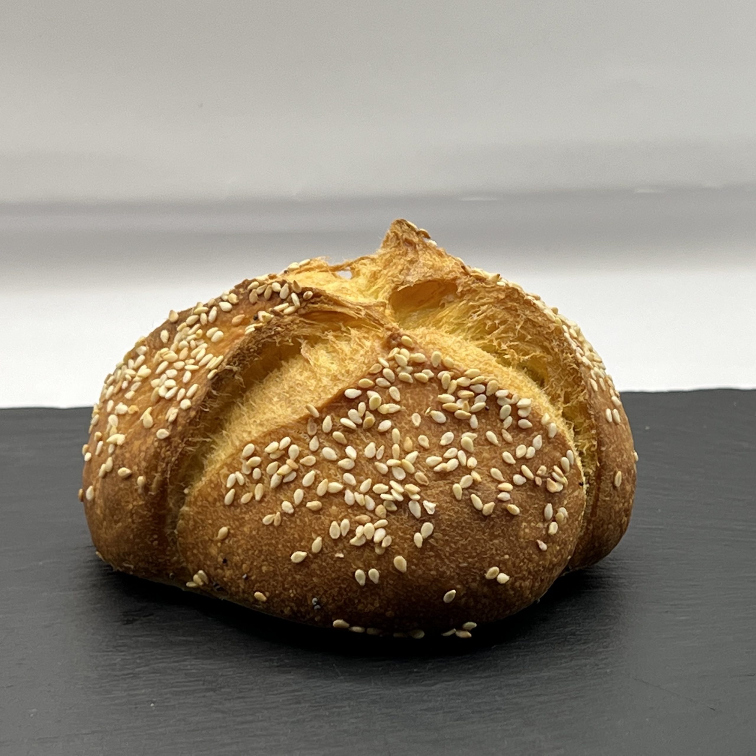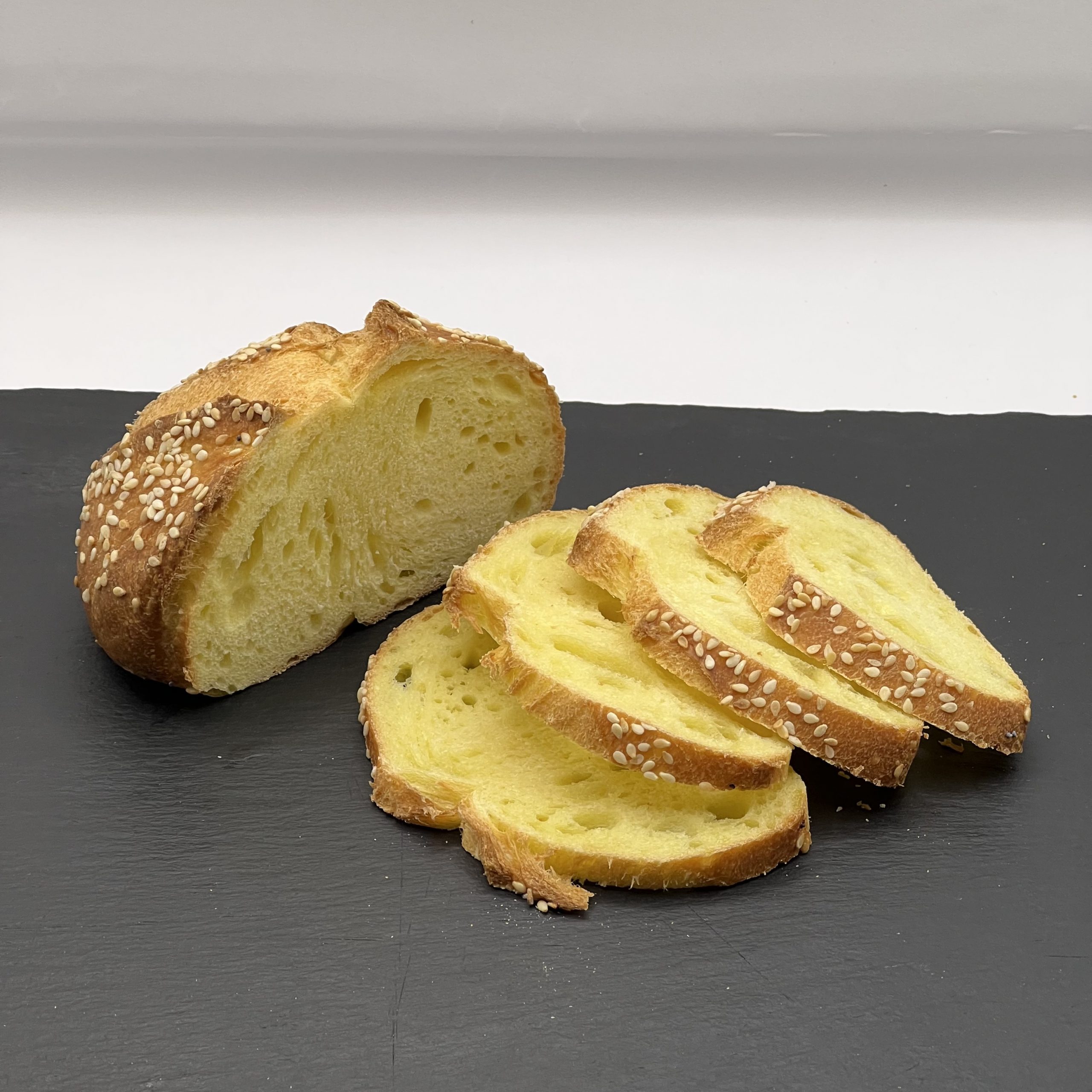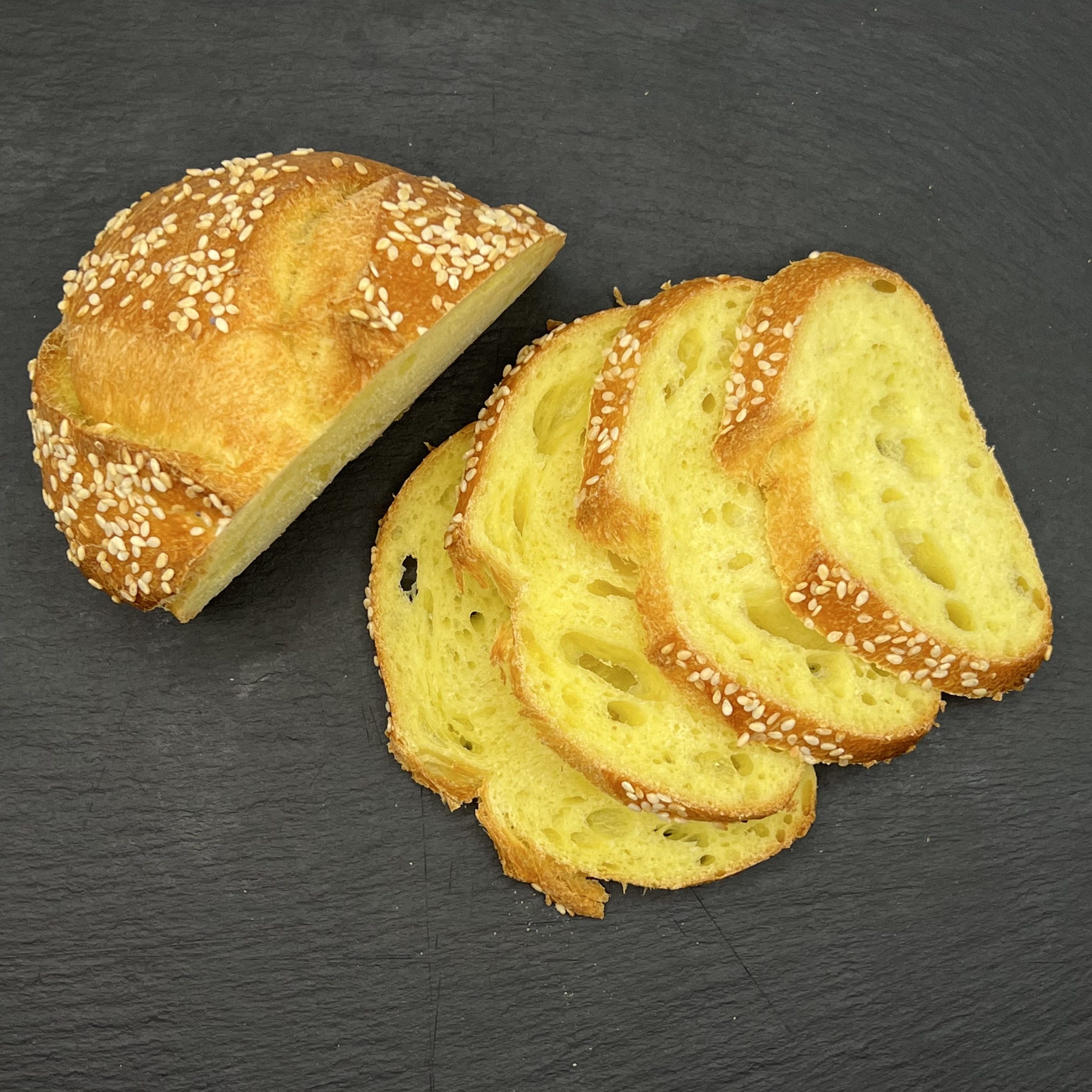 Склад: борошно пшеничне вищого ґатунку, пшенична закваска, яйця курей вільного випасу, оливкова олія холодного пресування, сіль морська, цукор, кунжут.
